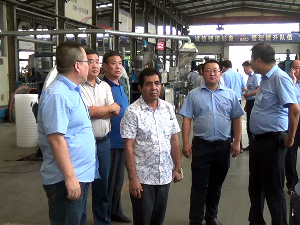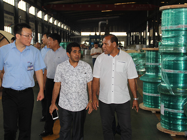图为东帝汶国家电力总公司总经理Helio Renato Ximenes(左四)在总裁雷文康(左五)陪同下在金年会金字招牌诚信至上线缆集团车间参观。